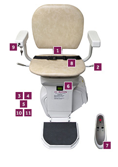 Possui um limite de peso de 120kg, em conjunto com um elegante assento e todos os recursos essenciais para assegurar uma viagem segura e confortável. A rotação é operada manualmente, o que lhe permite colocar em segurança o banco na direcção de desembarque no topo das escadas.